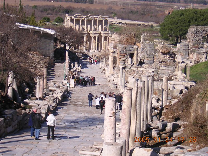 艾菲索斯城最主要的一條幹道--Curestes Way,道路的盡頭可以看到雄偉的圖書館建築,道路兩旁的石柱穿插著些許人像,這些人不一定是什麼偉人,而是只要對這個城市有所貢獻或者是捐獻 "足夠的金錢" 參與建設,便可以擁有一尊自己的雕像在路旁供來來往往的人觀賞、景仰,好玩的是,同一個人的雕像並不是永遠存在,它的頭是可以替換的喔!因此同一個位置上的雕像今年可能是你,但是明年你沒有所 "貢獻" 的話,人頭就會換成別人啦!所以也會看到沒有頭像的雕像存在。