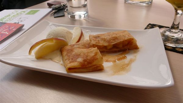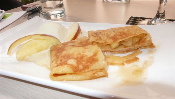 尤其是甜蜜焦糖蘋果派,有一球冰淇淋以及兩片蘋果切片。